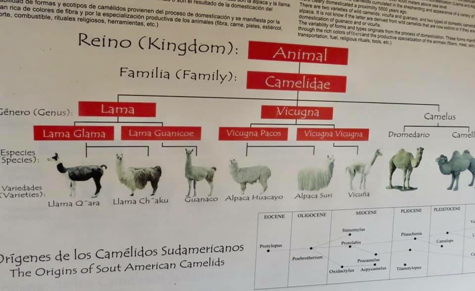 根據該中心所展示有關偶蹄目駱駝科(Camelidae)的「族譜」分為羊駝屬(Lama /Llama) 、小羊駝屬(Vicugna) 與駱駝屬(Camelus) 三大類;此地所飼養的是前兩類;每一類又分為三種不同名的「族群」,實在有點複雜。