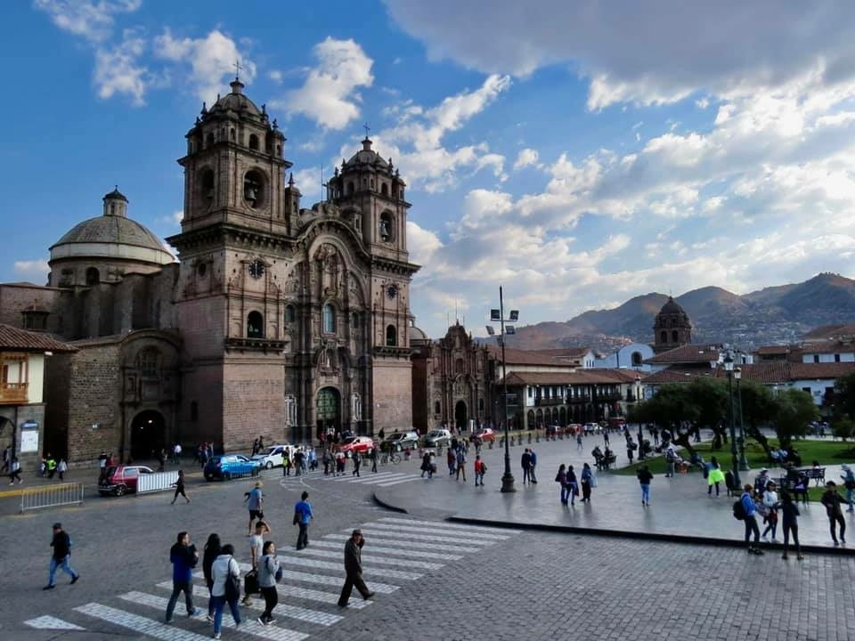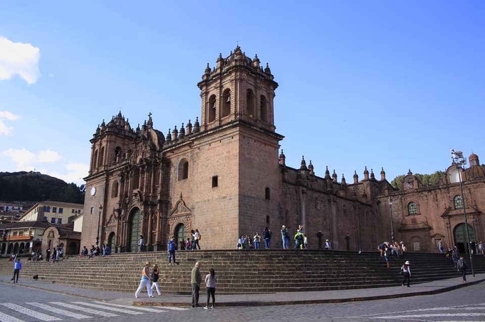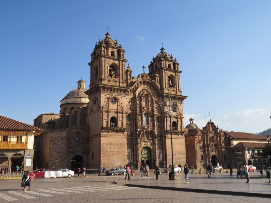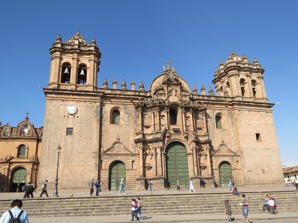 在這廣場上, 有造型雄偉且最醒目的兩座教堂;一是建於 1559 年,花了近一個世紀才完成,是西班牙殖民時期代表性建築的庫斯科主教座堂 (英Cusco Cathedral/西La Catedral)【內部陳列可觀的庫司科畫派油畫,融合了歐洲十六、七世紀的主流藝術及當時安地斯人的文化】。