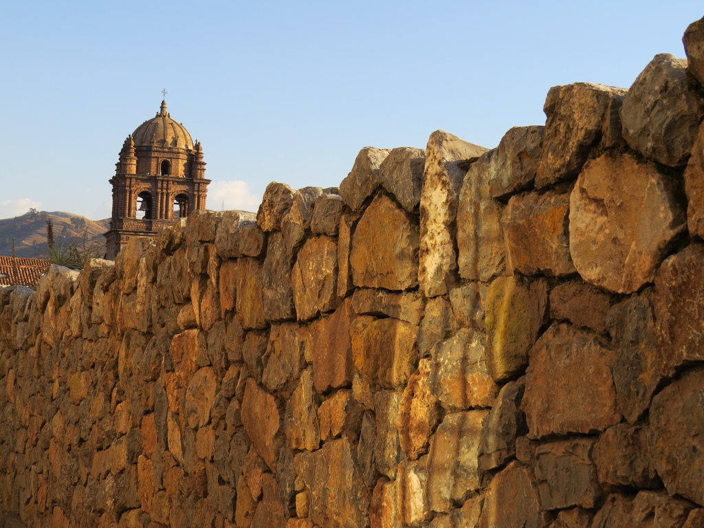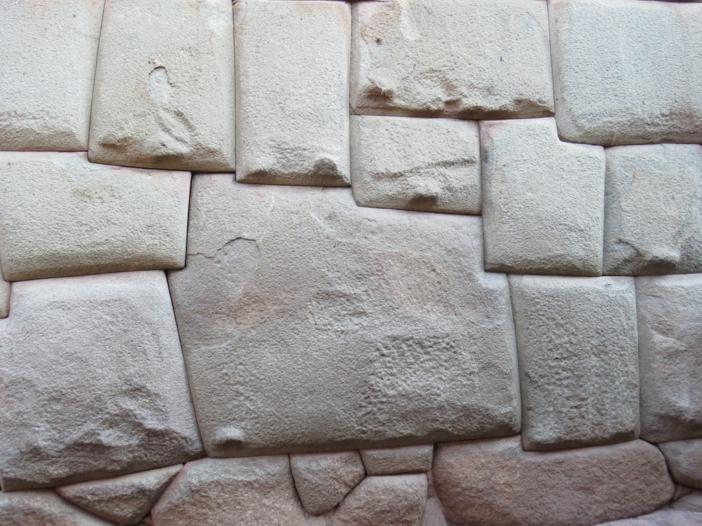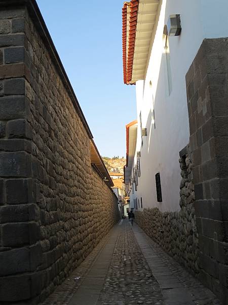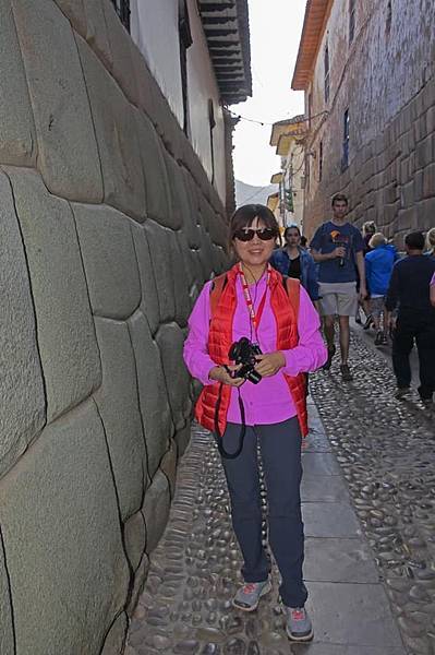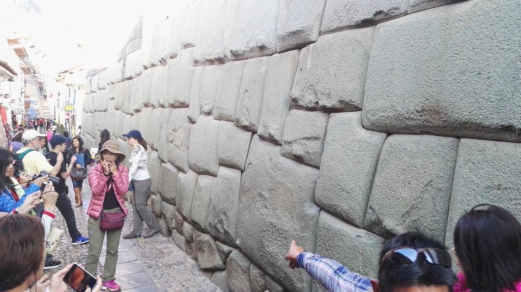 小米導遊接著又帶我們穿過幾條狹窄巷弄,在隱身於一隅之地【綿延約600公尺的羅伊托街(Callejon de Loreto)】「發掘」到又是讓人讚嘆古印加文明不可或缺一部分的「十二角石 (英“Twelve-angled stone”、西“ Piedra de los doce angulos”)」。至今的科技文明都無法解釋,印加人是如何將不同形狀及大小的石頭間不需黏著劑而能無縫接著(且接縫處連一張紙都難以插入)的這種高超砌石技術。就因這塊12個角的石頭平整而嚴密的砌合,歷經再多再大的地震它卻始終都能屹立不搖。