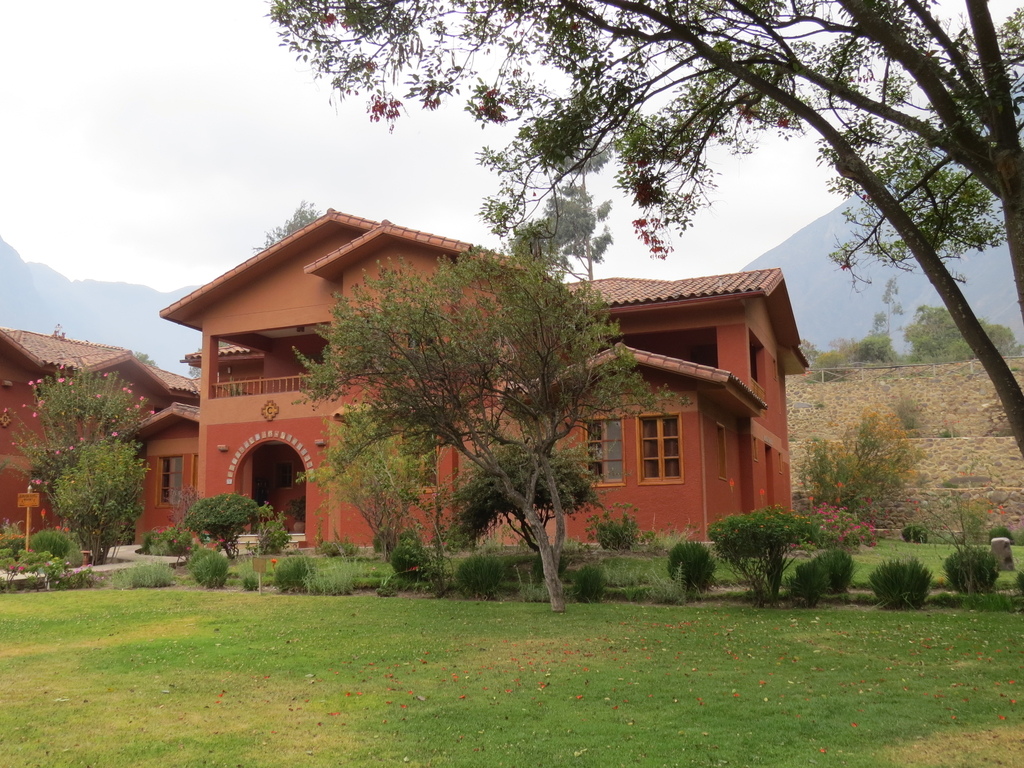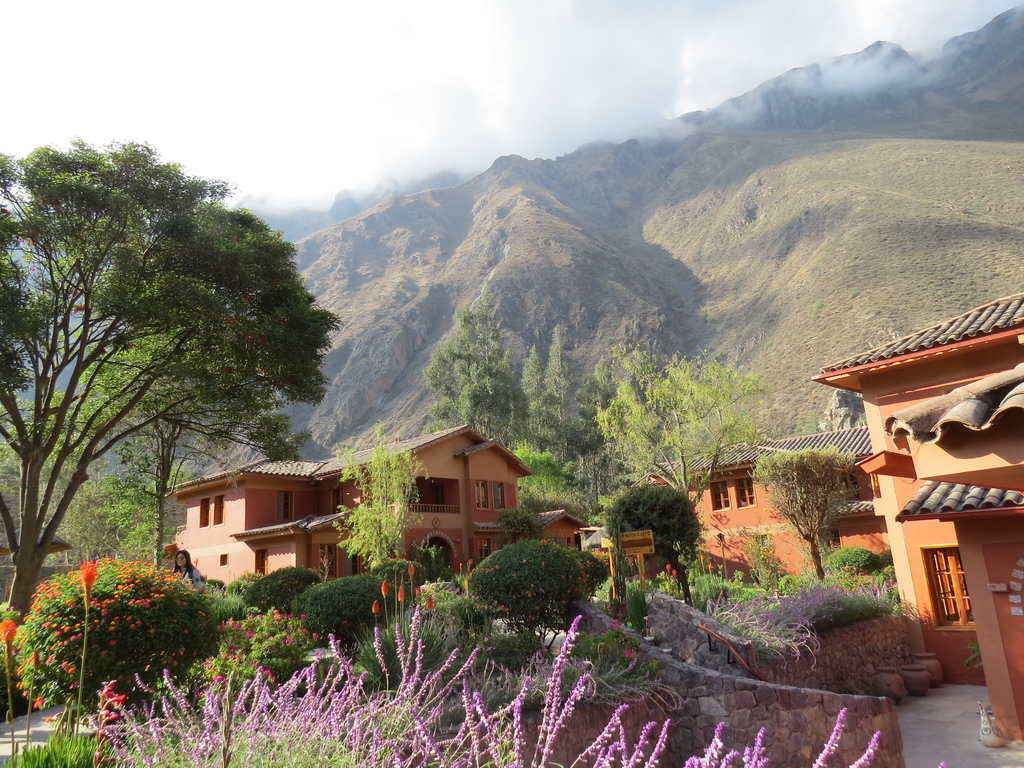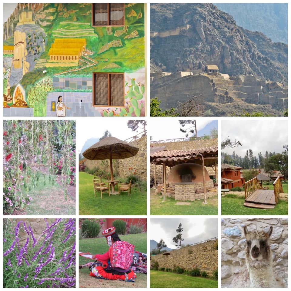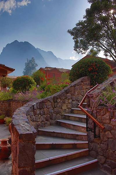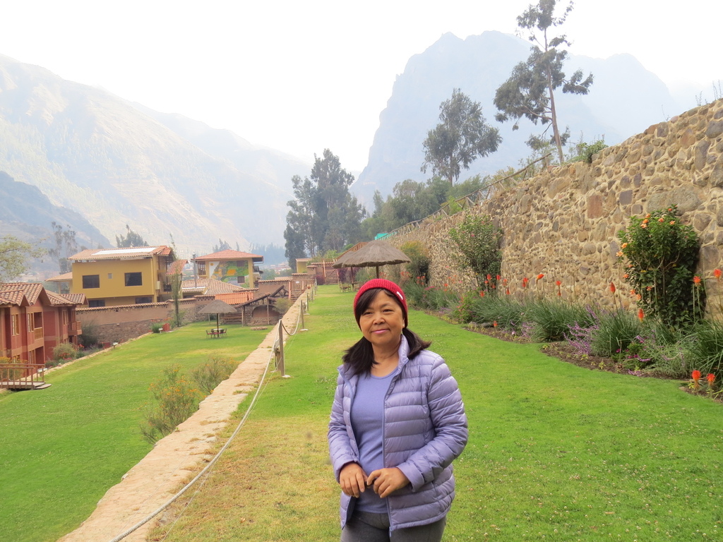 第三天(10/7)早餐前呼吸著幾無污染的新鮮空氣逛逛這被美麗山景所包圍的旅館戶外設施…石牆、木階、窯房、草亭、瓦屋、藝術壁畫,加上溫遜友善的羊駝、不知名的花卉、織布中的印加原住民婦女,還有遠方山頭上印加建築遺跡…構成一幅幅超美感的自然油畫。這是繼數日前亞馬遜雨林旅館後在旅途中又住過的一相當特殊「驛站」。