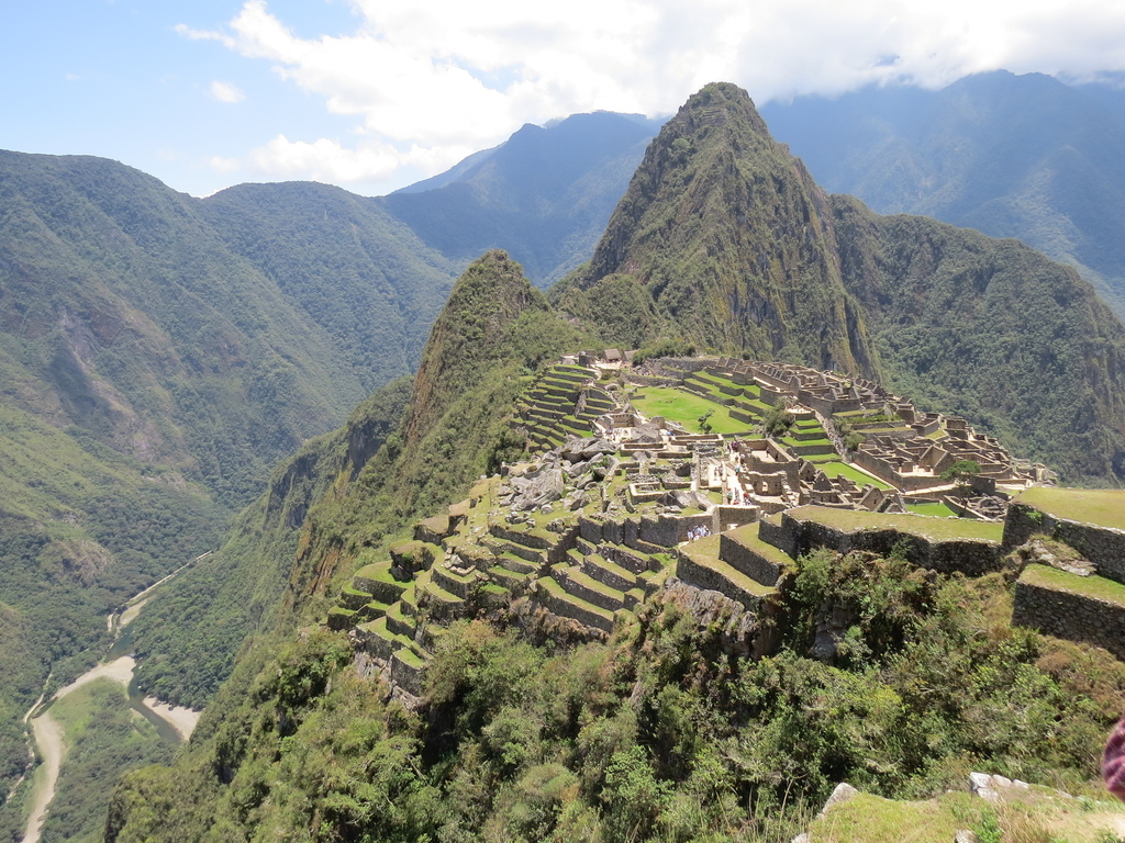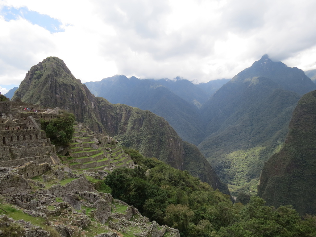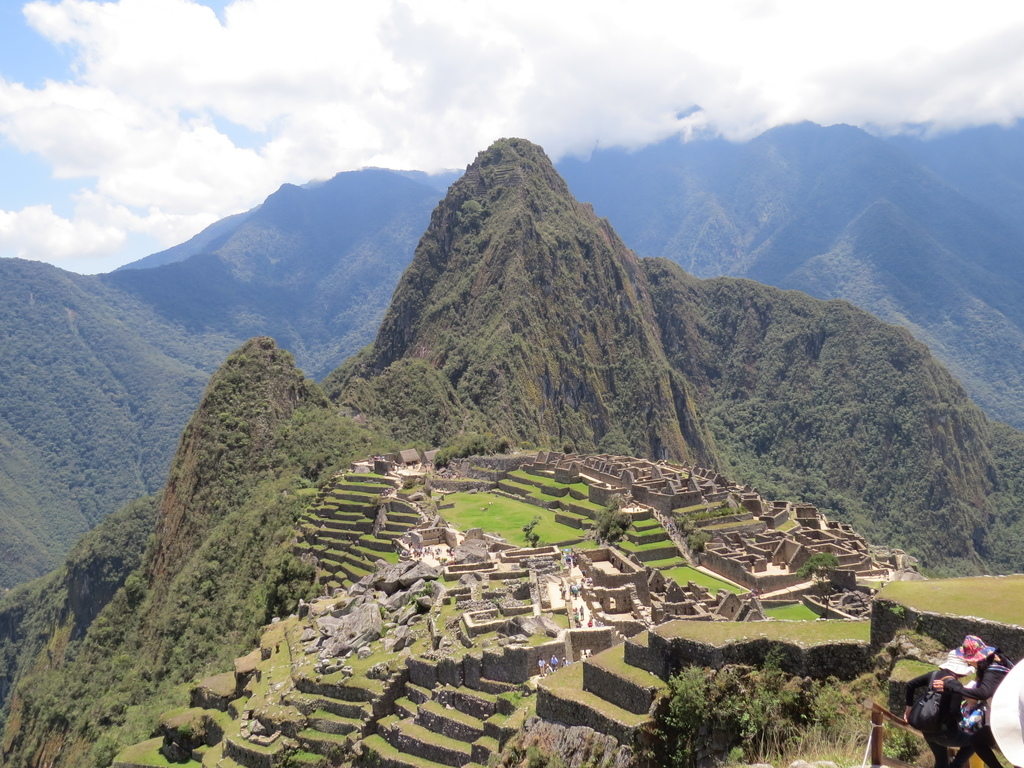 火車抵熱水鎮站【海拔降為為2038公尺】後,再搭接駁巴士爬山行駛30分鐘才終於來到整個遺址高聳在海拔2350~2440米的山脊上,俯瞰著烏魯班巴河谷「世界新七大奇觀 (New Seven Wonders of the World)」之一,被稱為「空中城市」、「失落之城」【印加語為”古老的山頭”之意】的古印加帝國遺址之一的馬丘比丘 (Machu Picchu)。