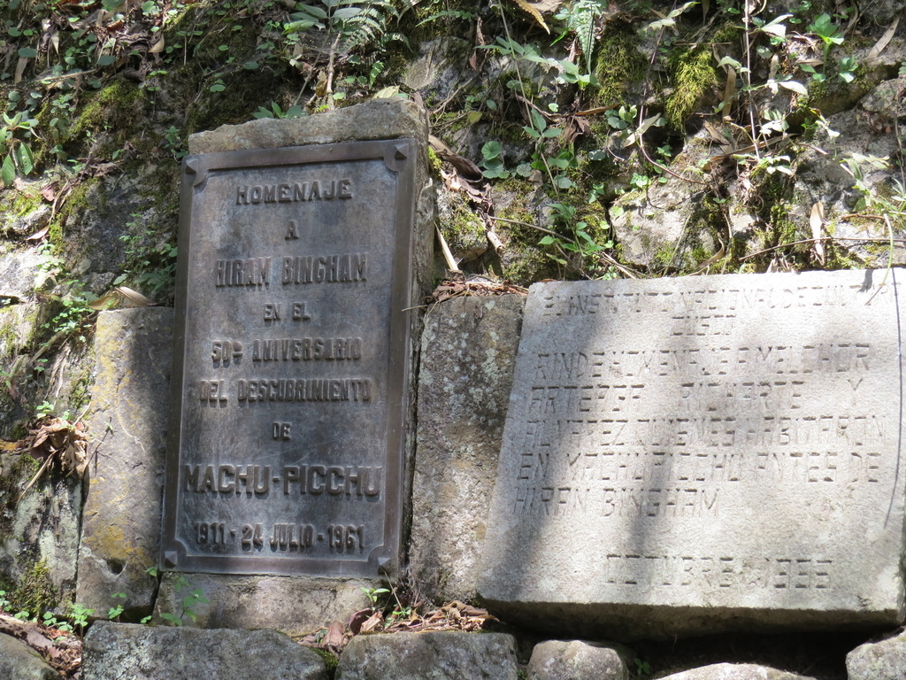 我當天在熱水鎮還找到了一塊於1961年所立,紀念那位所謂的讓馬丘比丘揚名的「發現者」Hiram Bingham 50週年的碑誌,可見秘魯人真厚道。話說回到,那傢伙居然把馬丘比丘的古蹟遺物強行掠奪至耶魯大學。事後,祕魯政府則鍥而不捨追討多年,甚至進行法律訴訟而在歐巴馬總統協助下,終將第一批文物366件於2011年3月30日歸還回祕魯【註四】