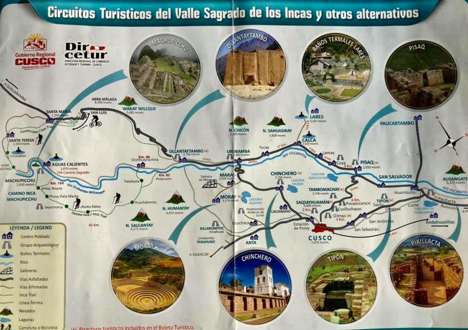 回程從歐亞泰坦堡 (Ollantaytambo) 驅車經烏魯班巴、皮薩克 (Pisac) 全程93公里景觀之路返回庫斯科。其實,我們來回走的這一條路就是稱為“聖谷 (Sacred Valley)”的精華地段【因氣候、環境與水源使其適合耕種,而成為印加人的大穀倉,故印加人視為上天所賜的神聖谷地】以下旅途中所蒐集到的照片就是以庫斯科為中心探索都算位於聖谷的八大印加古鎮的地圖。
