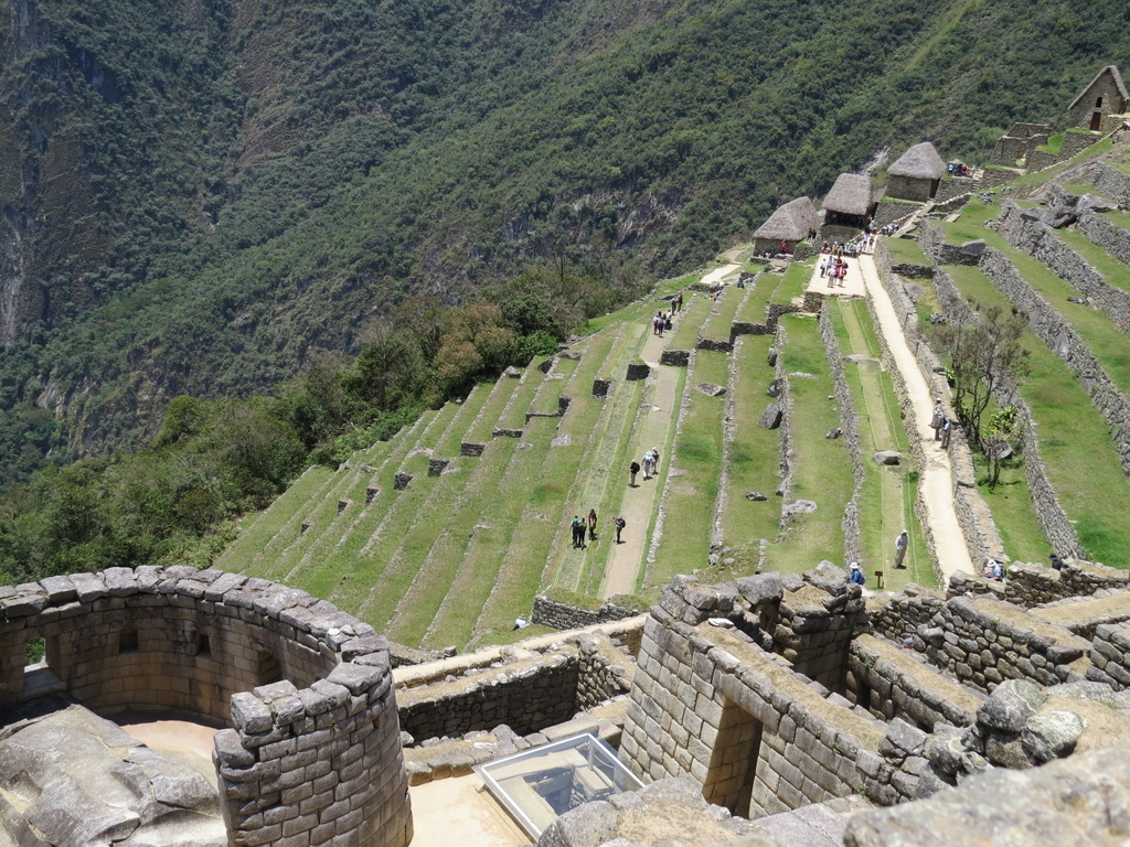 整個遺蹟由約140個建築物組成,按照考古學家的考證,馬丘比丘可區分為三個組成部分:「通俗區」(墓園、梯田【如以下照片1~2】、公園、避難所)、「祭祀與貴族區(宮殿、居住區)」【如以下照片3~4】。