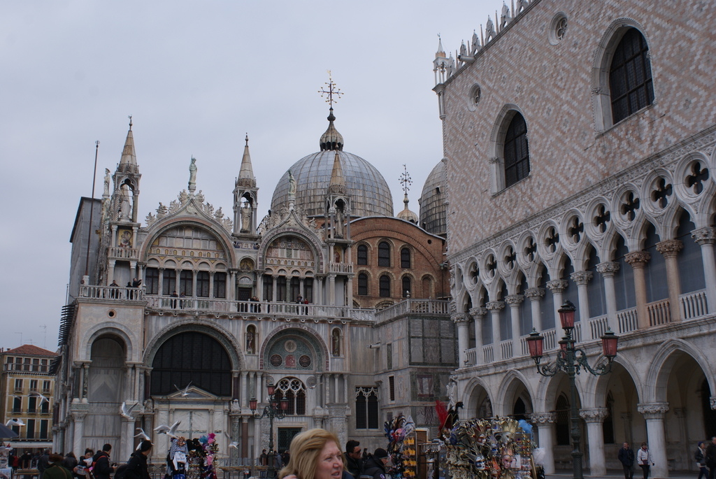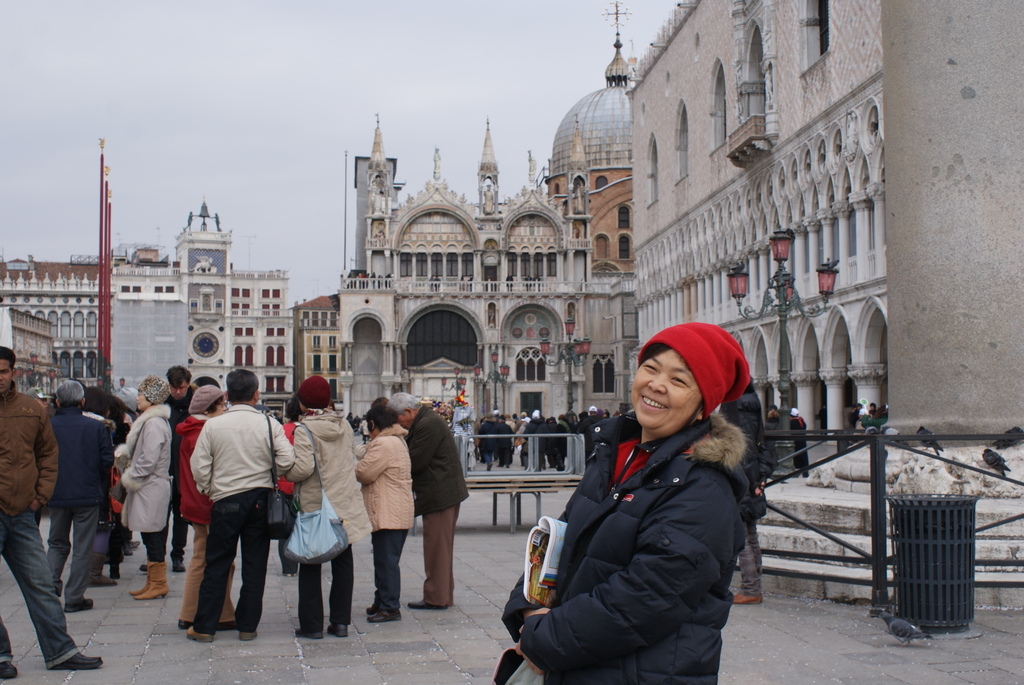 次日,才算真正開始威尼斯的「經典之行」。不消5分鐘我們就可從民宿穿過小巷、水道,步行到「聖馬可廣場(Piazza di San Marco)」。一到廣場,霎然進入眼簾的是一棟棟交錯著「宏偉」、「典雅」、「精緻」與「俊挺」等那種feel的建築。走入建於西元828年、揉合拜占庭、哥德、東方風格為設計主調的的聖馬可大教堂(Basilica di San Marco),看到目不暇給的豐富藝術珍品,內部「金碧輝煌」華麗的裝飾更使人嘆為觀止。