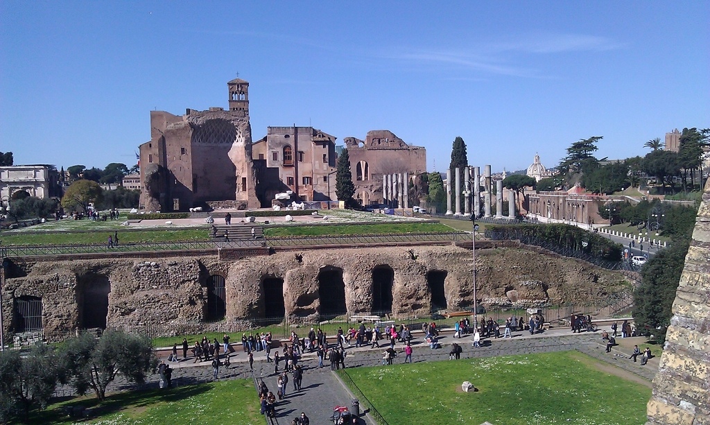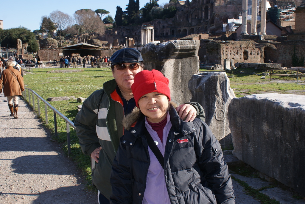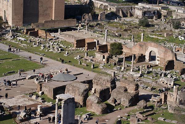 續步行到建於西元前約600年前的羅馬議事廣場 (Foro Romano);雖觸目所及都是「斷垣殘壁」(由石頭所建構的「神殿」、塞維里凱旋門、石柱、殘缺不全的神像、女祭司雕像),但那可是2,500年前羅馬人政治、經濟、文化與生活的中心,更是共和時期決定國家大政方向之重地。